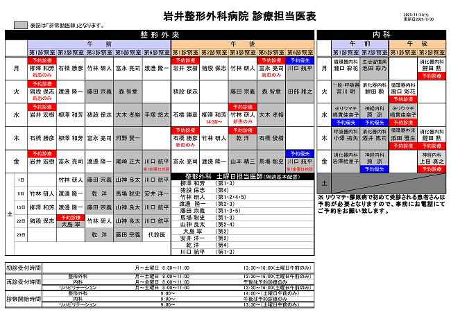 11月05日(水) 午後 | 整形外科 | 内山 | なし | |