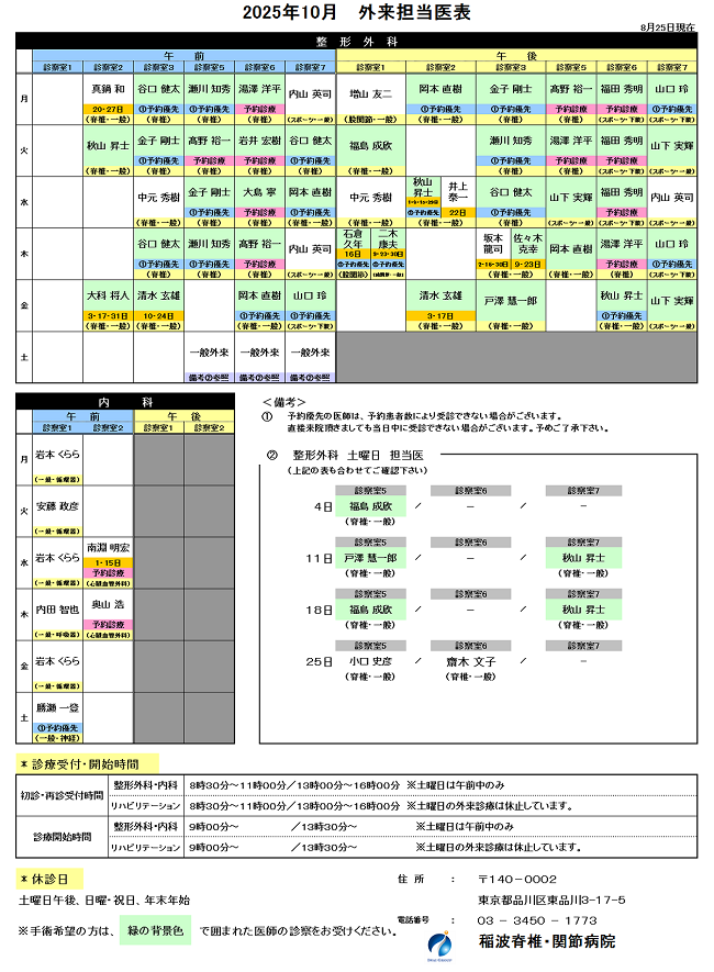 10月29日(水) 午後 | 整形外科 | 内山 | なし | |