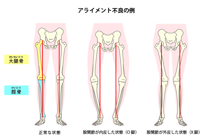 人間の足は体重の軸が通るライン(アライメント)が、膝のほぼ中心を通っています。これにより、体重を関節全体の『面』で支えることができます。しかし変形性膝関節症の患者さんは、アライメントが膝の内側(いわゆるO脚)、または外側(いわゆるX脚)に傾いています。内側または外側の関節部分に体重がかり、全体重を局所の『点』で支えている状態になってしまいます。膝の局所に体重がかかるため、その部位の関節軟骨の損傷が加速している場合が多く、さらに膝の変形を助長している状態です。