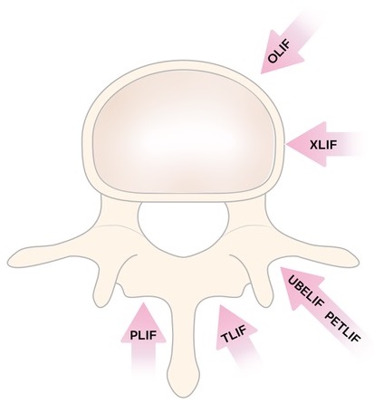 固定術は主に進入経路(身体のどこからアプローチするか)によって手術の方法が変わってきます。当院では主に背中側から(PLIFなど)か、側方から(XLIF、OLIFなど)アプローチする方法を採用しており、患者さんの病態に応じて適した方法を選択しています。