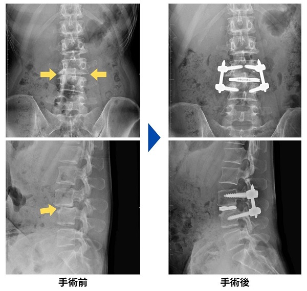 背中側から椎弓根にスクリュー(ネジ)を挿入し、ロッド(棒状)でスクリュー同士を連結、固定します。